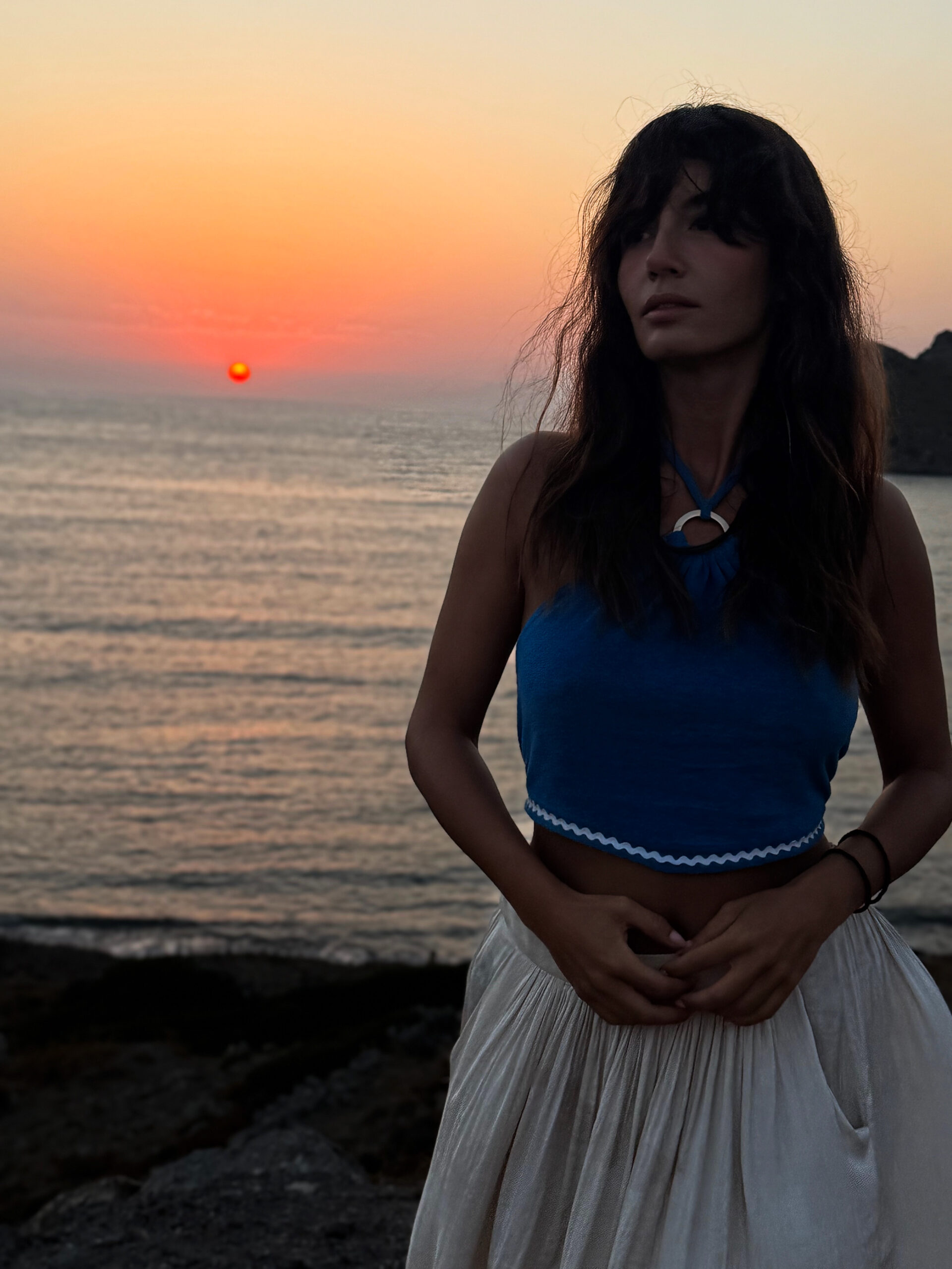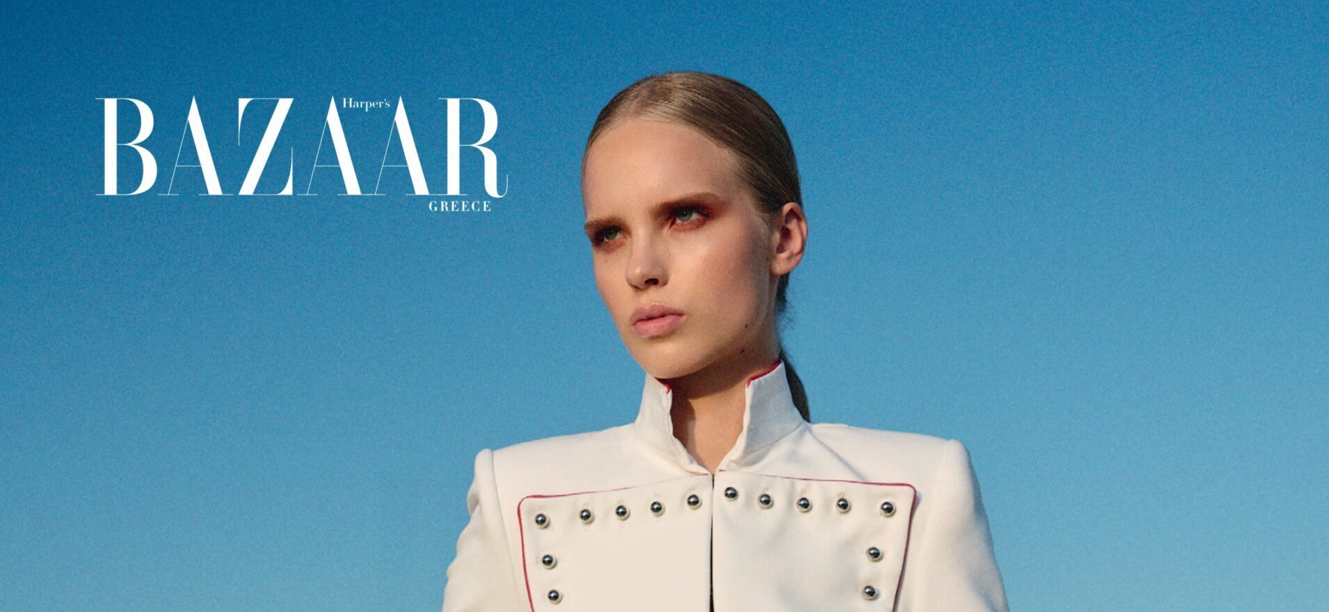 NEVRO steps into the September pages of Harper’s Bazaar Greece with a commanding silhouette: the Evzon military jacket and the Oval skirt, both in off-white. Photographed against the vast horizon of the Aegean, this