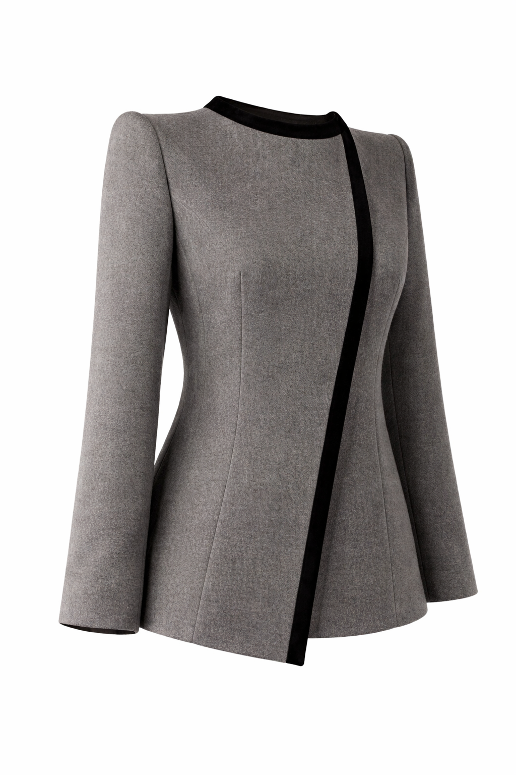 The Concrete Chic Blazer. A timeless grey wool, double-breasted design, crafted with meticulous hand stitching for a refined, artisanal touch.