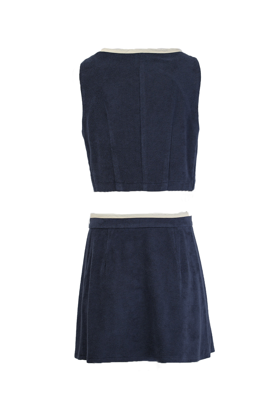 The Aegean Terry Asymmetrical Skirt brings coastal tailoring to life in rich blue terry cloth with cream piping, silver buttons, and an asymmetrical cut that channels timeless maritime ease.