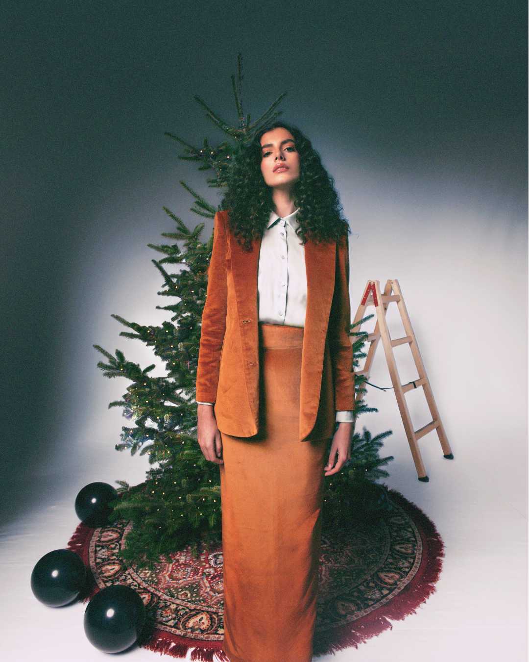 A sleek animalier velvet mini pencil skirt crafted from premium cotton-velvet with a sculpted, body-skimming fit. Its clean lines and rich texture make it the perfect statement bottom for festive dressing. Designed for versatility, it pairs seamlessly with any of the animalier jackets from the capsule.