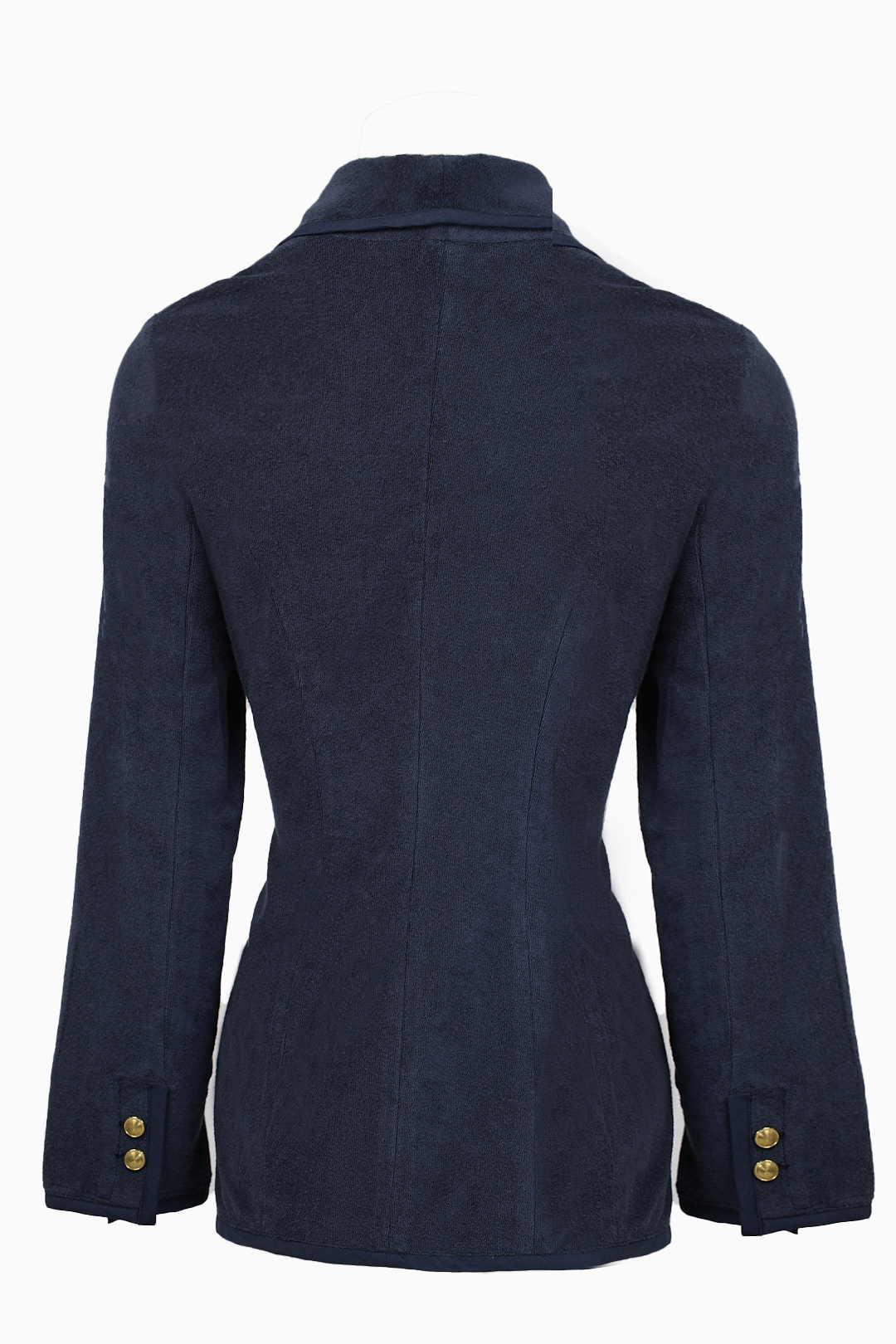 Tailored in breathable terry cloth with dark blue piping and gold buttons, the Pelagos Terry Blazer brings maritime depth and summer ease to a relaxed, single-breasted silhouette.