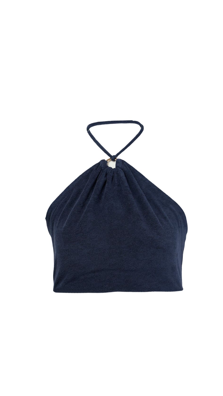The Pelagos Terry Bust captures the depth of the open sea in a sculptural halter silhouette, crafted from soft navy terry cloth with a gold ring detail and tonal dark blue piping.