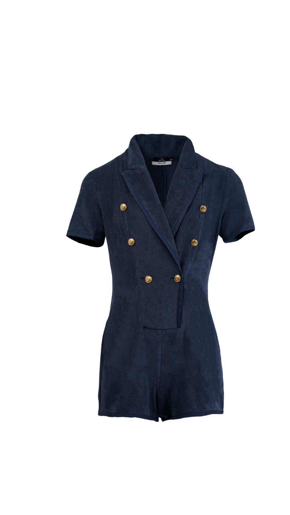 Inspired by the mystery and depth of the open sea, the Pelagos Terry Playsuit channels the crisp sophistication of suiting into a relaxed summer essential. Crafted from deep navy terry cloth, this double-breasted one-piece features structured peak lapels, gold metal buttons, and tonal dark blue accent piping that contours the body with quiet precision.