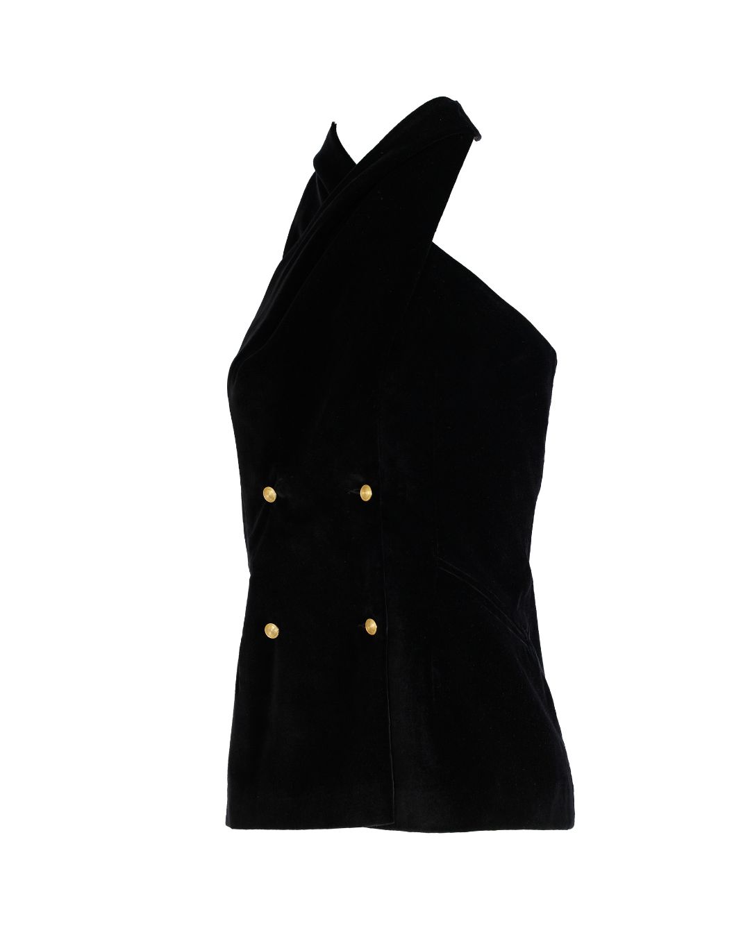 Sleek, sleeveless, and sharply tailored, it offers a modern interpretation of classic menswear—feminine, commanding, and unapologetically bold. Its rich velvet texture elevates any look, making it an instant statement piece for night events.