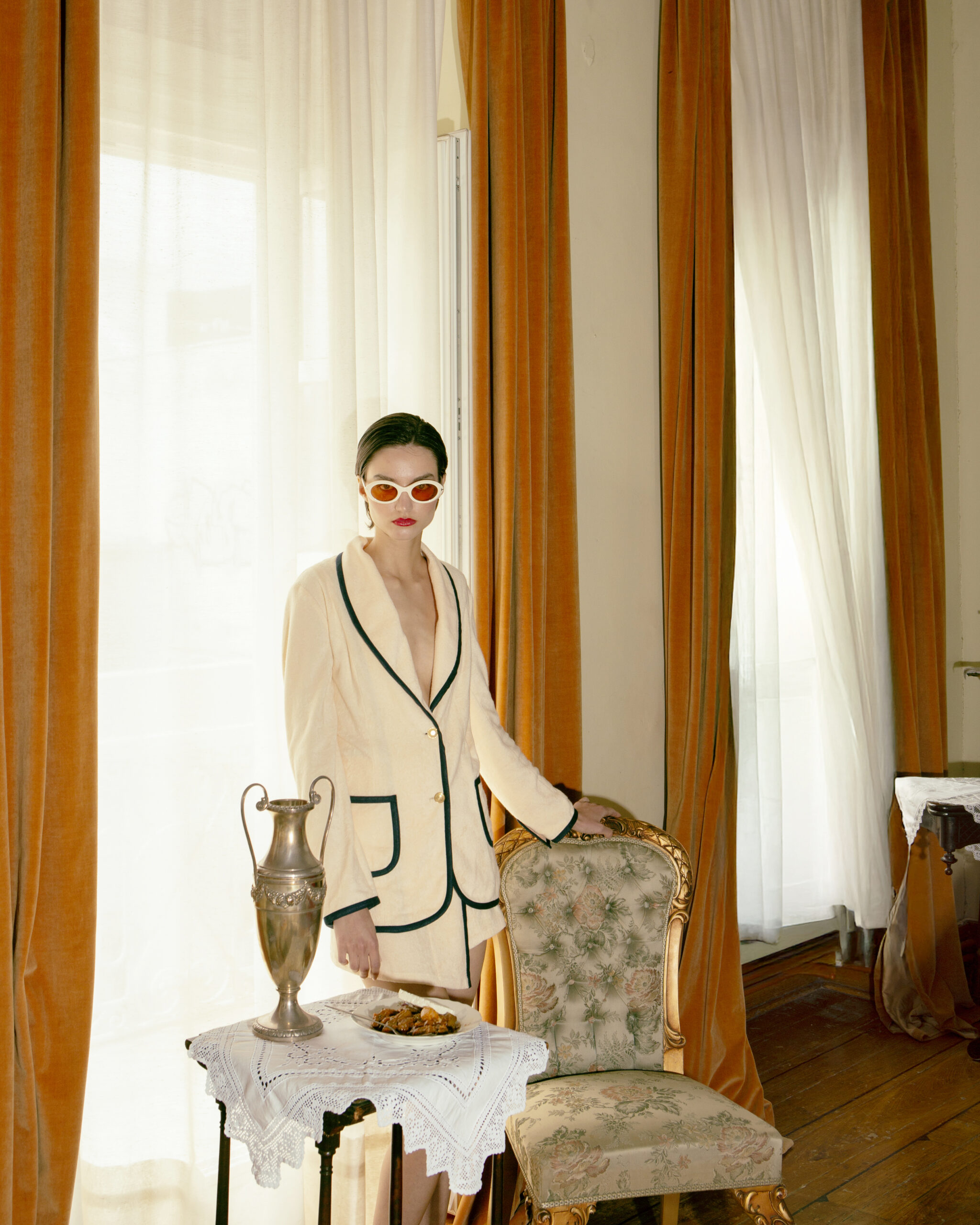 Like early light through linen curtains, the Vanilla Terry Blazer is soft yet structured, precise yet undone. Crafted from plush off-white terry cloth, it features elegant shawl lapels and deep navy blue piping—a quiet contrast that outlines its silhouette with sculptural clarity.