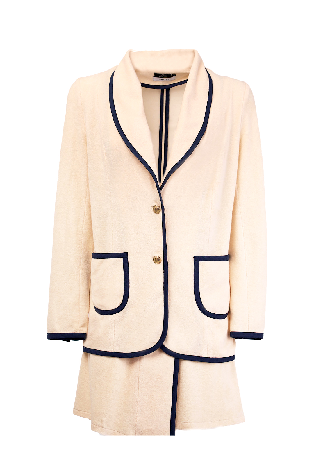 Softly tailored in plush ivory terry, the Vanilla Terry Blazer pairs minimalist elegance with deep navy piping and a breathable silhouette—designed for refined summer ease.